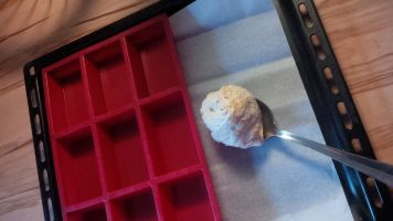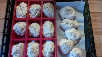 Frisches Brot zum Frühstück! Am Abend das Mehl in einer Schüssel mischen, kaltes Wasser dazugeben, Hefe und Salz dazu. Alles gut vermischen. Über Nacht in den Kühlschrank stellen. In der Früh den Teig in 10 Weckerlportionen auf ein Backblech geben (oder in eine Backform, s. Abbildung). Backrohr auf 225 °C vorheizen, Brötchen 20 Minuten backen (schauen, ob Brot braun ist). Fertig!